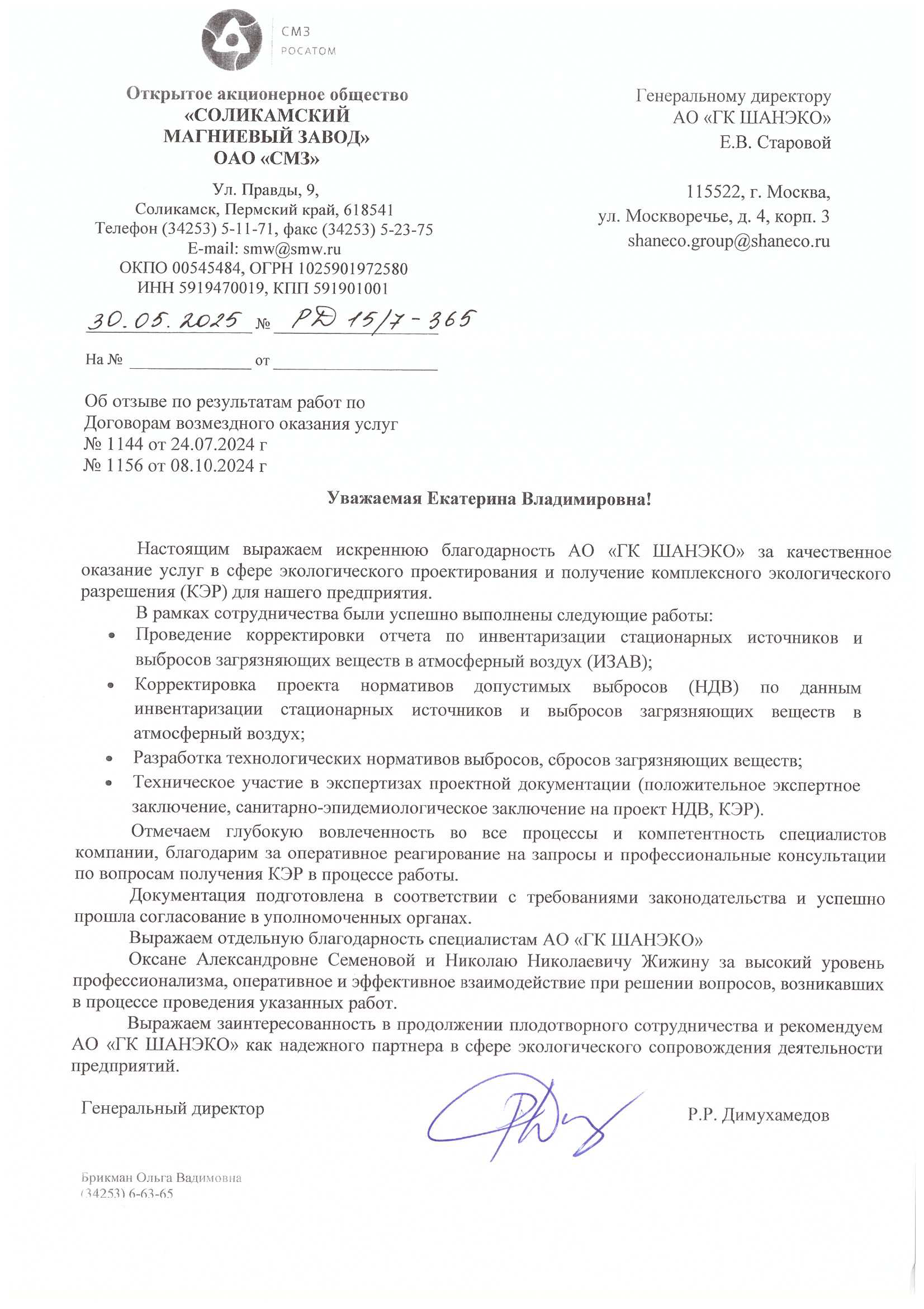 Выражаем заинтересованность в продолжении плодотворного сотрудничества и рекомендуем АО "ГК ШАНЭКО" как надежного партнера в сфере экологического сопровождения деятельности предприятий.