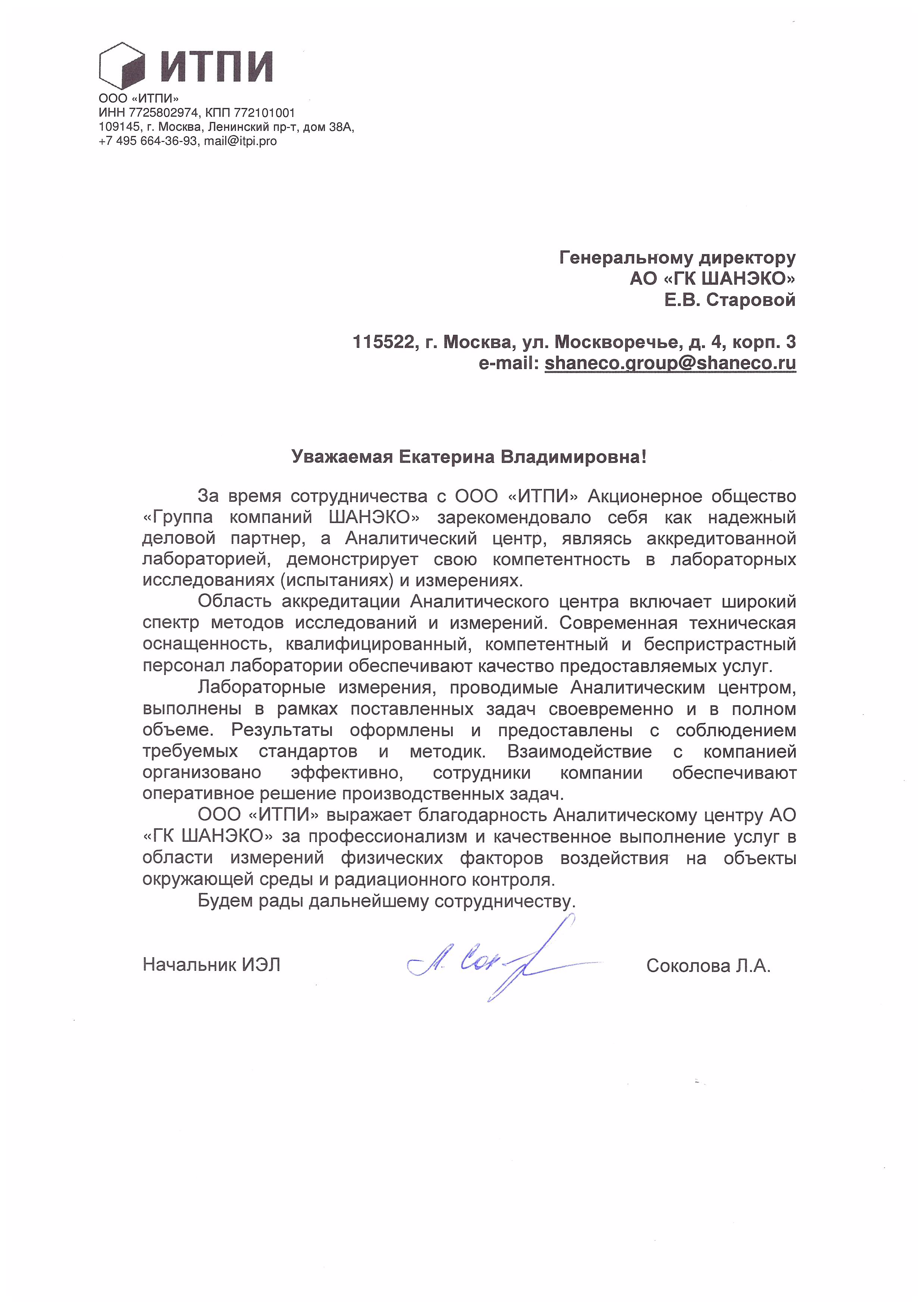 During our collaboration with ITPI LLC, SHANECO Group of Companies has established itself as a reliable business partner, and the Analytical Center, as an accredited laboratory, demonstrates its competence in laboratory research (testing) and measurements.