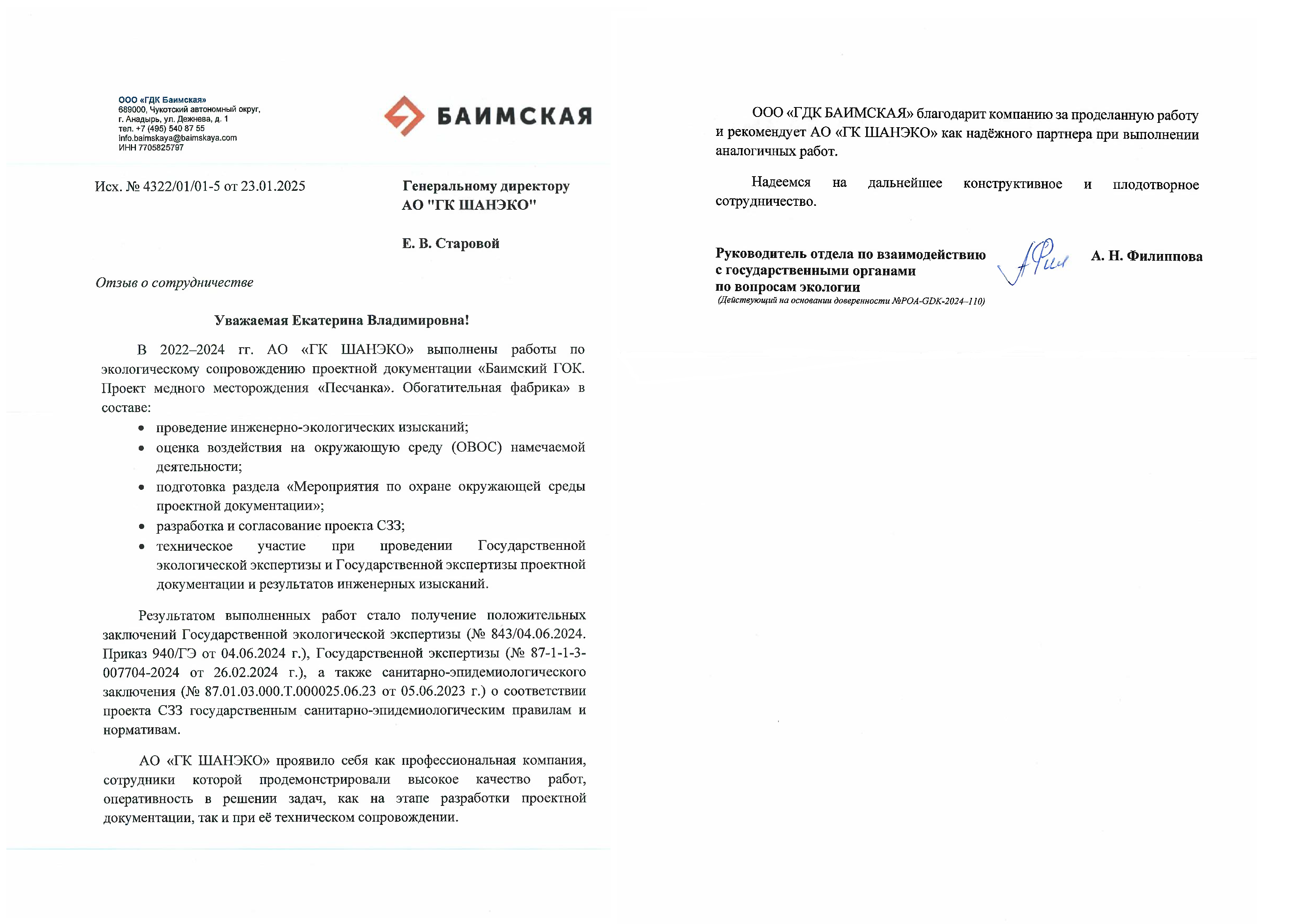 Выражаем заинтересованность в продолжении плодотворного сотрудничества и рекомендуем АО "ГК ШАНЭКО" как надежного партнера в сфере экологического сопровождения деятельности предприятий.